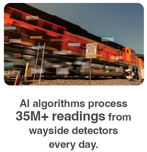 BNSF uses advanced technologies, including MVS and thermal sensors, to monitor the health of more than 1.5 million wheels in motion across our network. With Artificial Intelligence (AI) capabilities, we can now analyze inspection data more effectively than ever. AI algorithms sift through more than 35 million readings from our wayside detectors each day, enabling us to predict maintenance needs in advance. This lowers the likelihood of breakdowns and service interruptions, enhancing fluidity and safety. We are leveraging AI to improve safety and efficiency in many other areas as well, including using AI algorithms to bolster our Automated Yard Check system and to optimize how we build and load our trains.