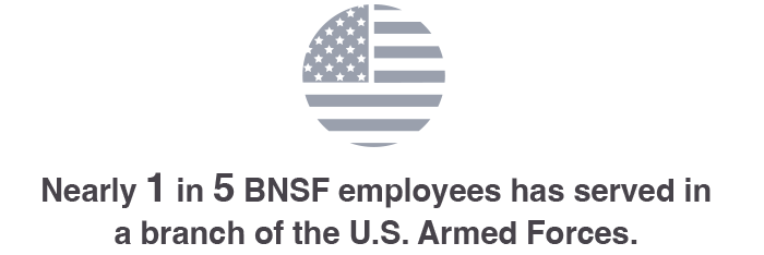 BNSF knows military veterans have the experience, determination and dependability to be teammates that can always be counted on. That’s why we have a long legacy as a top employer of military veterans. In fact, nearly a one in five BNSF employees has served in the U.S. Armed Forces. We also support reservists by providing time off for training and deployment. Our BRAVE (Business Resource and Veterans Engagement) group helps veterans, reservists and first responders engage with communities, build leadership skills and develop their careers.
