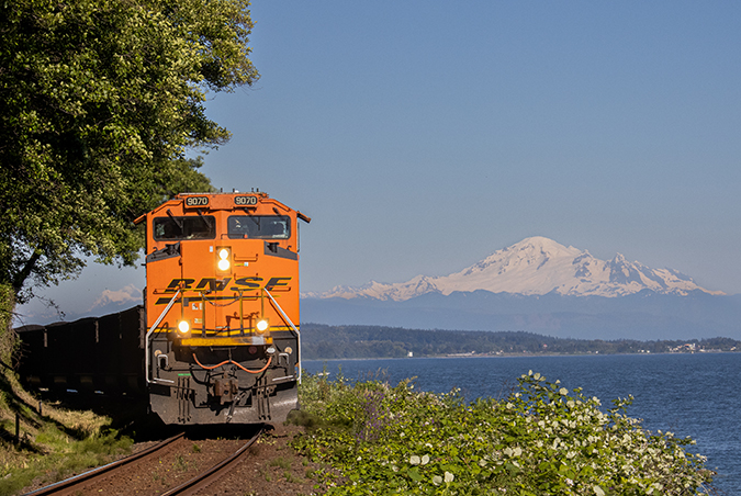 “A BNSF coal train coasts along the shore of the Pacific Northwest, headed toward Roberts Bank Terminal in British Columbia, with Mt. Baker looming in the background.”