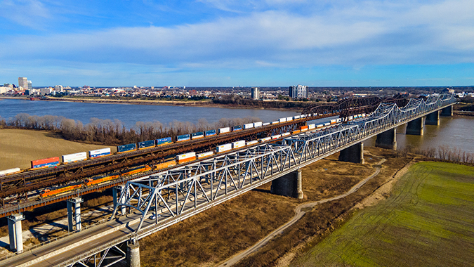“A BNSF intermodal train comes over the Frisco Bridge from Memphis, Tennessee, into West Memphis, Arkansas, crossing the muddy Mississippi River on a cold January day.”