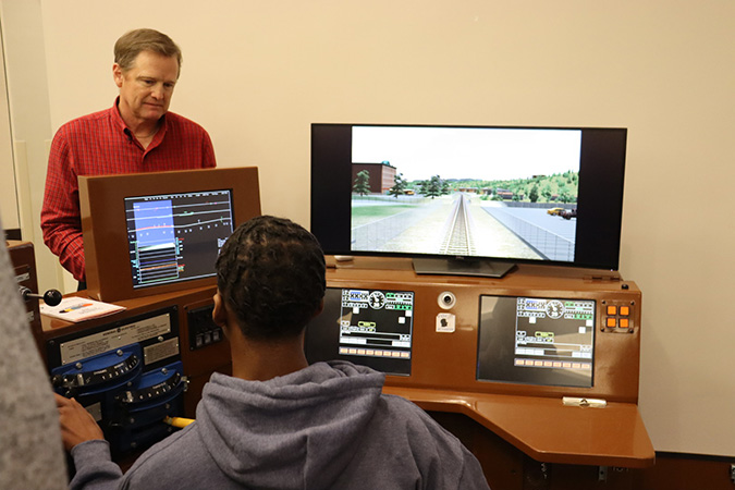 Keeping teenagers’ attention is challenging, so some of the newest and most advanced gadgetry is on display, and the students get to try some of it hands-on. A locomotive simulator was available to experience what it’s like to be behind a throttle. A virtual reality headset gave an immersive experience in locomotive maintenance.
