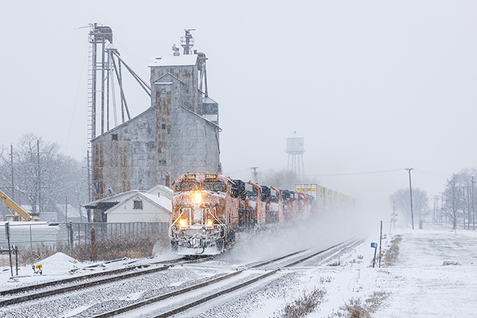 “This was taken of a westbound sand train kicking up fresh snow through Greenwood, Nebraska,” Brodersen said.