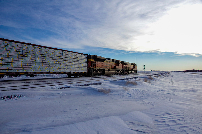 Debertin grabbed this eye-catching shot of an eastbound lumber train near Berthold, North Dakota, in February 2023.