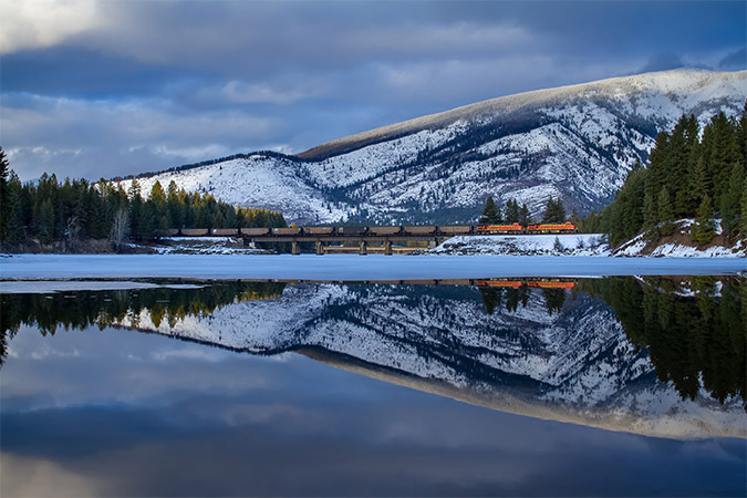 "Northwest Montana’s Cabinet Mountain Range and a BNSF empty coal train reflect in the calm, cold waters of Trout Creek just west of Trout Creek, Mont., on January 27, 2020."