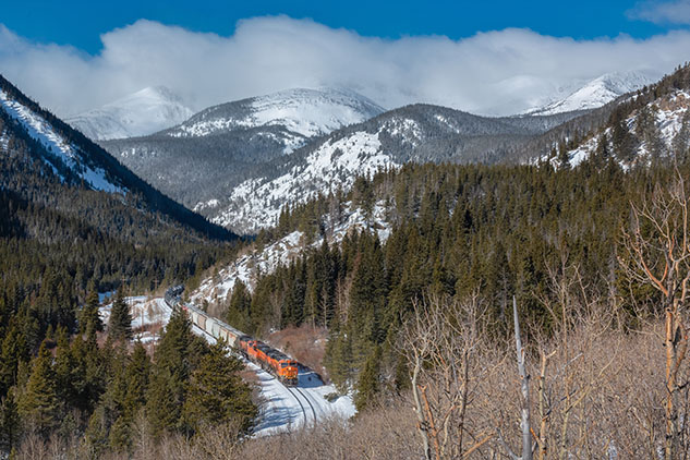 A BNSF mixed freight glides over the Great Divide in Colorado on a slightly cloudy day. The contrast between the snow-covered landscape and the emerging sunlight creates a magical scene, capturing the essence of winter railroading. Lindgren’s photo encapsulates the serene beauty of a winter's day.