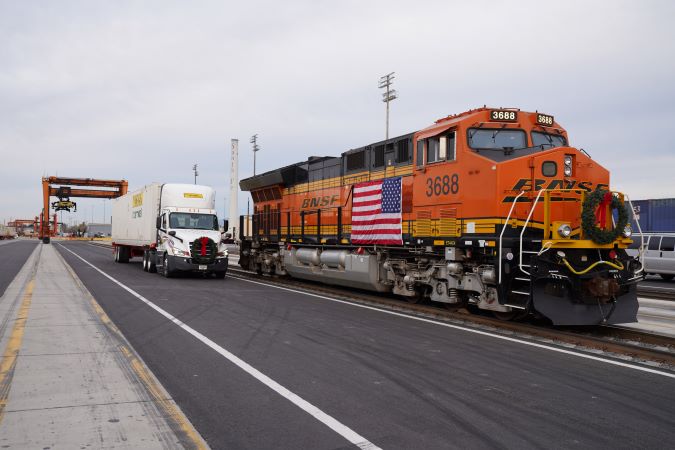 General Manager Rich Dennison for the California Division added: “My thanks to our employees who came out to support this shipment to San Bernardino and elsewhere. BNSF hauls a lot of gifts that go under the tree, and when people wake up Christmas morning, they may not know that our employees had a part in moving those goods and making their holiday so special. Containers full of wreaths are the gift that we can give to our veterans and their families to show them that we appreciate their service.”