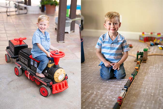 Abram loves playing with his wooden toy engines, riding his little mechanical train, waving at passing trains, and watching videos on the mechanics of trains.