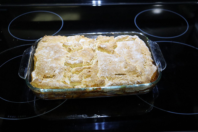 As the apples are baking, mix the baking mix with milk, creating a dough. If the dough is too sticky, add enough flour to be able to roll it out correctly. Once the dough is rolled out and the apples are done baking, add dough in sections to the top of the apples, with overlapping layers if needed to hold it together.
