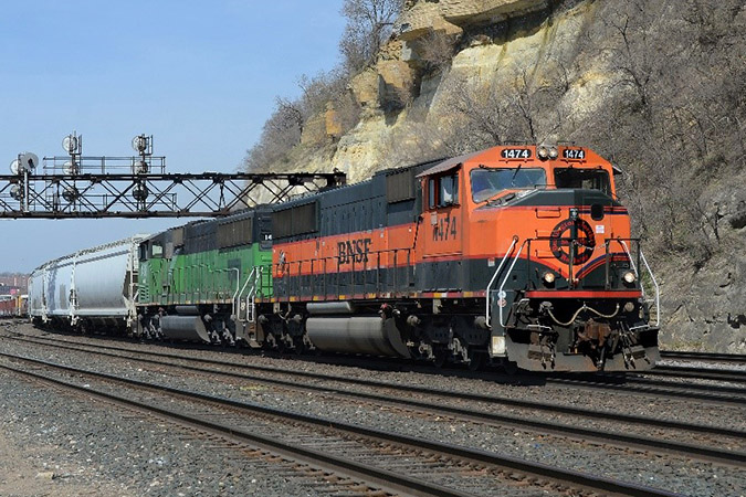 This cream and green paint scheme is featured on a small number of locomotives. It’s named after Gerald Grinstein, former CEO of BNSF predecessor Burlington Northern, and is sometimes referred to informally as “Grinstein Green.” One of the remaining locomotives featuring this unique paint scheme is numbered 9535 and now features a BNSF logo.