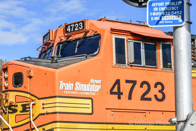 This locomotive, No. 4723, was featured in the Microsoft Train Simulator computer game, which was very popular with railfans upon its release in 2001. The locomotive Microsoft modeled the simulator after has a decal on the side today that reads “Microsoft Train Simulator – Featured Locomotive.”