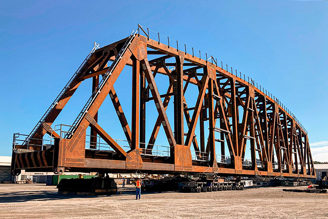 With the “all clear” signal, the assembled span was slowly moved on Aug. 24 using two pairs of 40-wheel self-propelled flatbed trailers that positioned it from an industrial yard, down a ramp onto the barge deck.