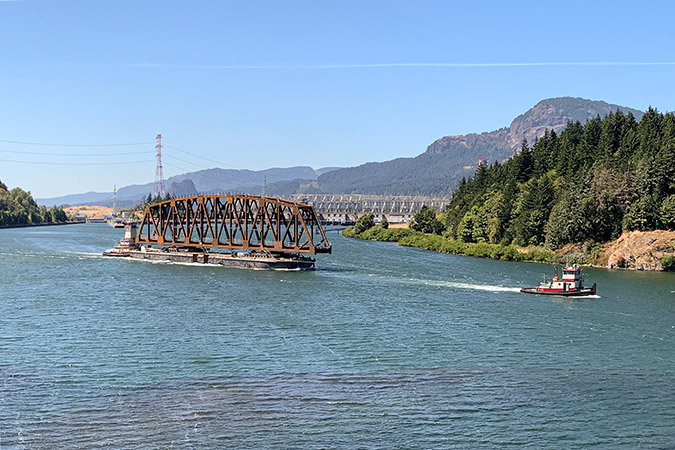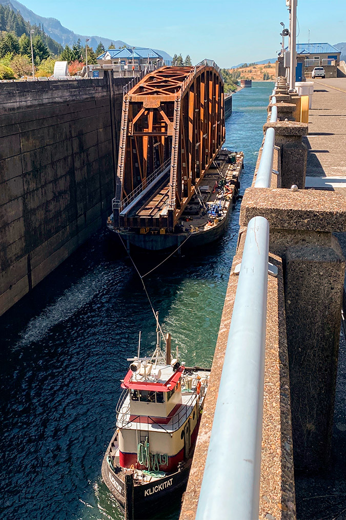 Halfway through its trip, the bridge traveled through the Bonneville Lock.