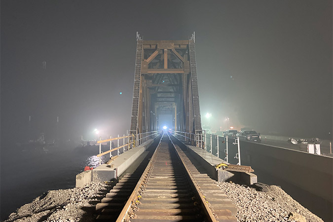Having learned how to float bridges in during earlier replacements helped, and come late August, after lots of discussion about winds speeds and weather, the “all clear” was given to proceed. In 18 days the project was completed, with the first train crossing the new bridge Sept. 14.