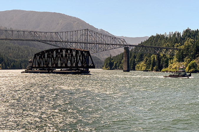 That’s what happened when BNSF floated in a new bridge to replace a century-old steel truss bridge over Drano Lake in Washington. The lake is fed by the Columbia River and in a remote area, with the bridge on BNSF’s line running east from Vancouver – an important route for grain export.