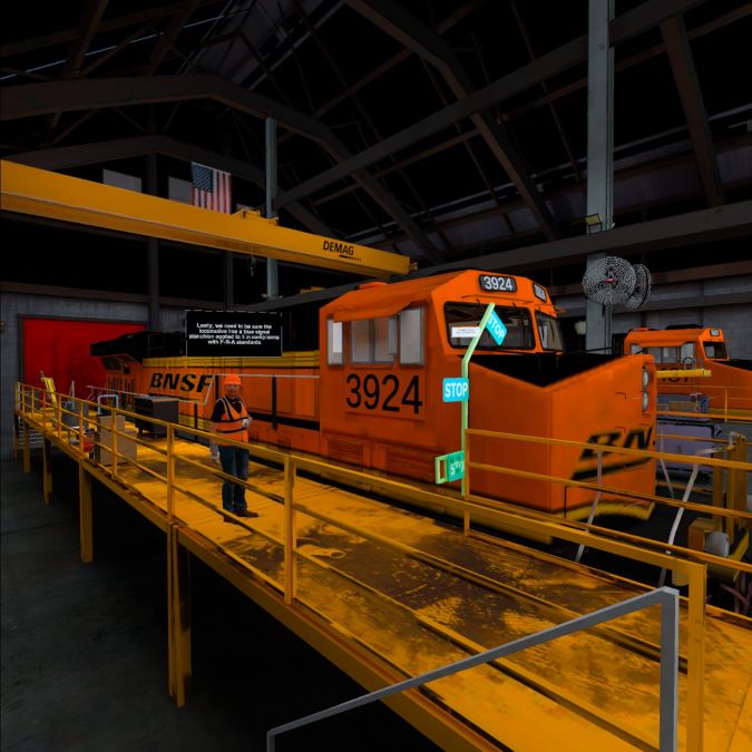 You’re handed a headset and told to stand within a square marked off on the floor with tape. After lowering the headset over your eyes, you’re no longer in the training room. You’re in a BNSF mechanical shop, standing on the walkway of an orange locomotive.
