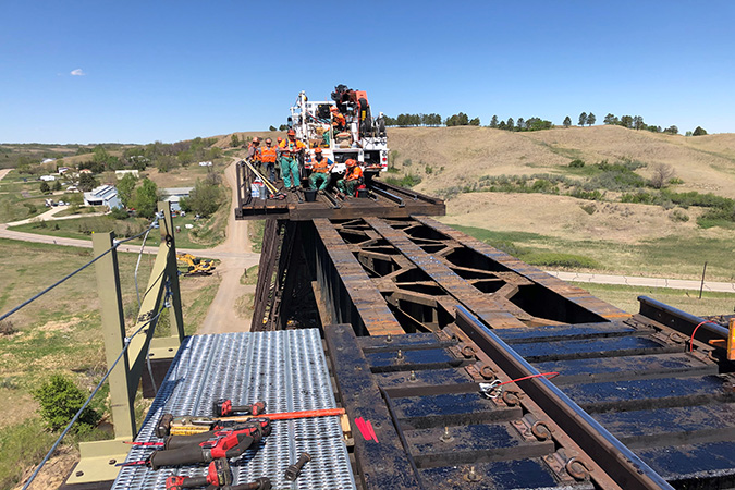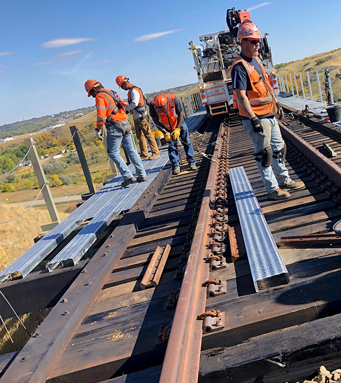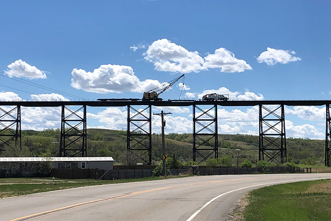 Our Engineering Structures team on the Montana Division responded with a “Challenge accepted!” when it was time to replace the entire deck of the Gassman Coulee Trestle rail bridge in North Dakota, about 5 miles west of Minot.