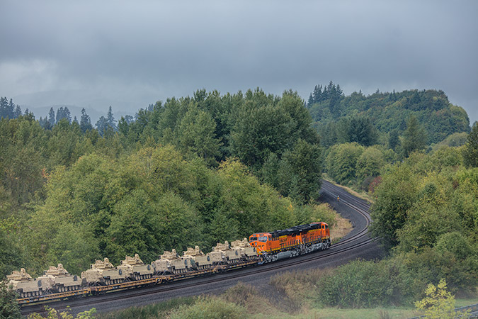 “The military no longer uses rail to move troops, but we do move tanks and other equipment,” said Lorinser. “We typically use state-of-the-art, chain tie-down flatcars that can adjust to carry large vehicles or we can load equipment into 20- to 40-foot containers.”