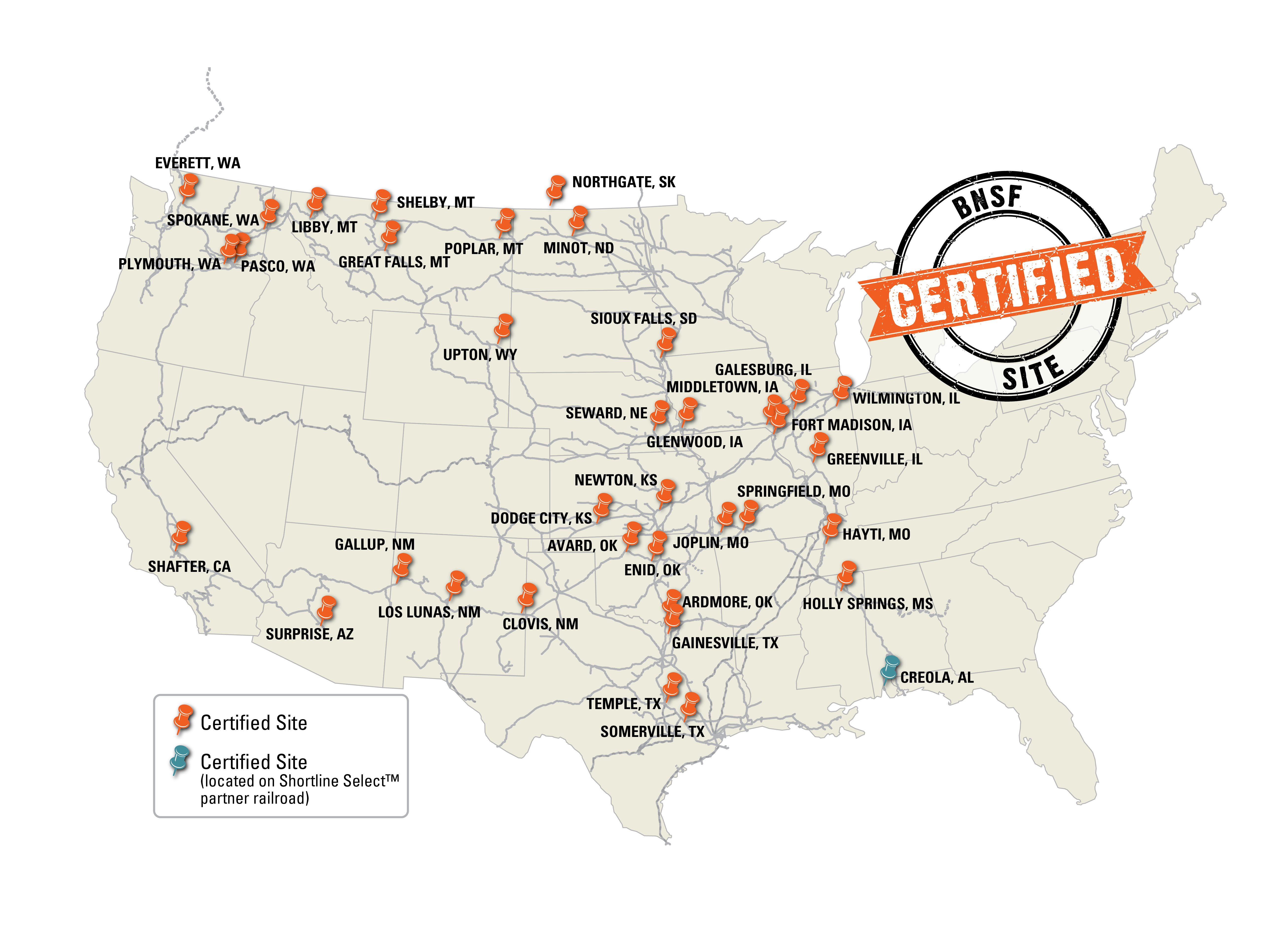 BNSF is helping you reach new customers and opportunities by developing Certified Sites in rural markets. Discover BNSF Certified Sites below:
